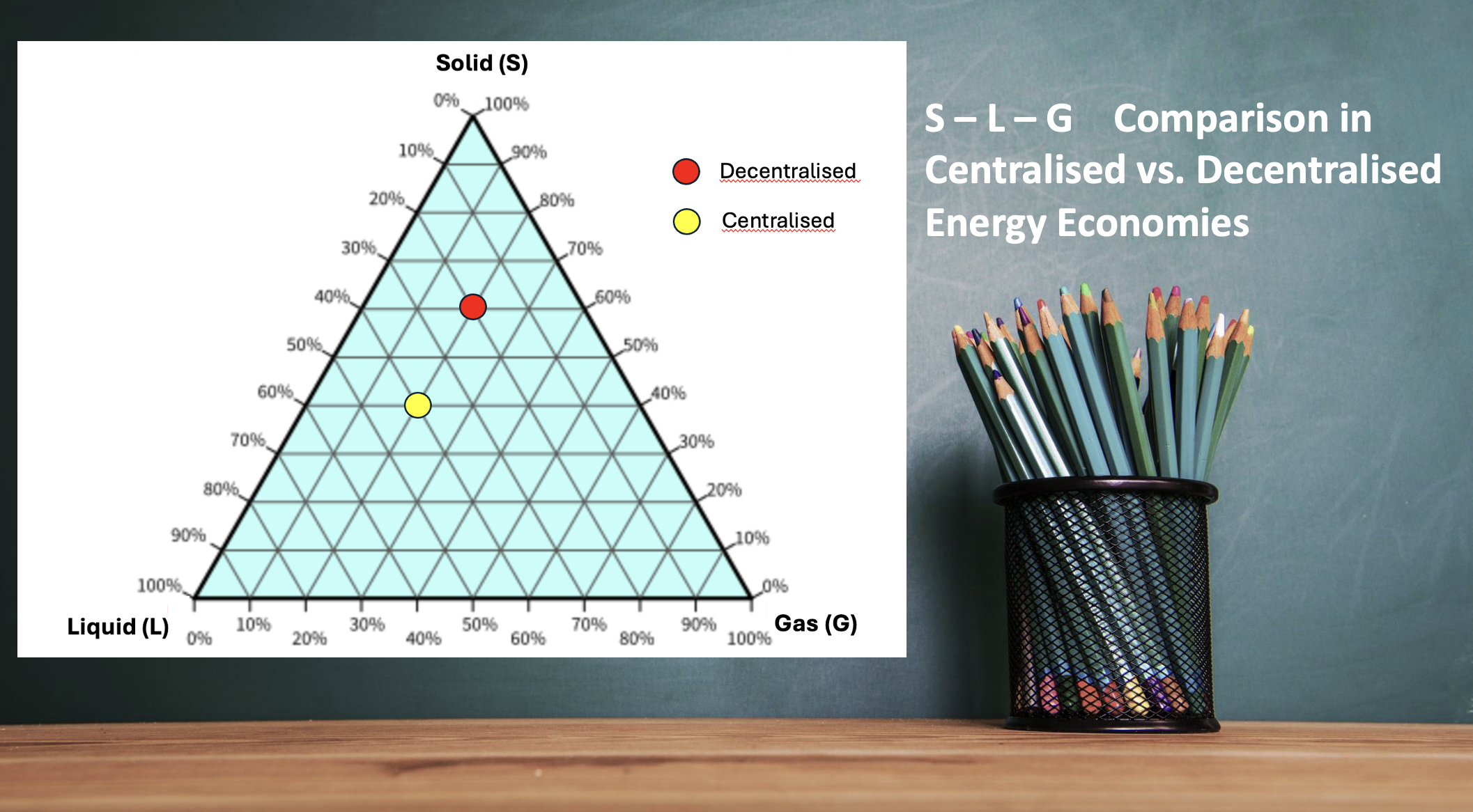 In DECENTRALISED energy, the emphasis shifts toward solid-state conversion technologies (PV, batteries, solid oxide fuel cells), meaning solid-phase materials dominate.
